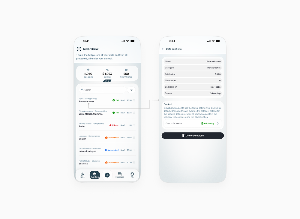 Platforms treat user data like a hidden asset. People rarely understand what is collected, what it becomes, or who profits from it. River needed to make data sovereignty feel accessible rather than technical.