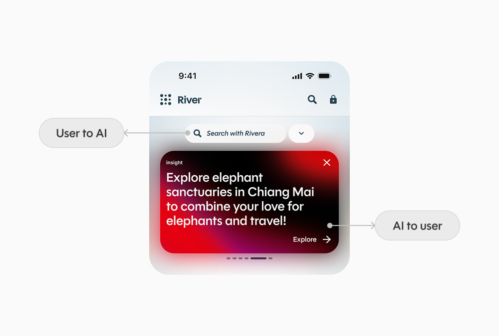 Rivera is River’s AI assistant, powered by Gemini, designed to feel familiar while staying connected to user owned data. It supports fast chat responses and structured BentoBox outputs for deeper requests. Alongside it, River surfaces insights proactively through a carousel and contextual moments across the app.