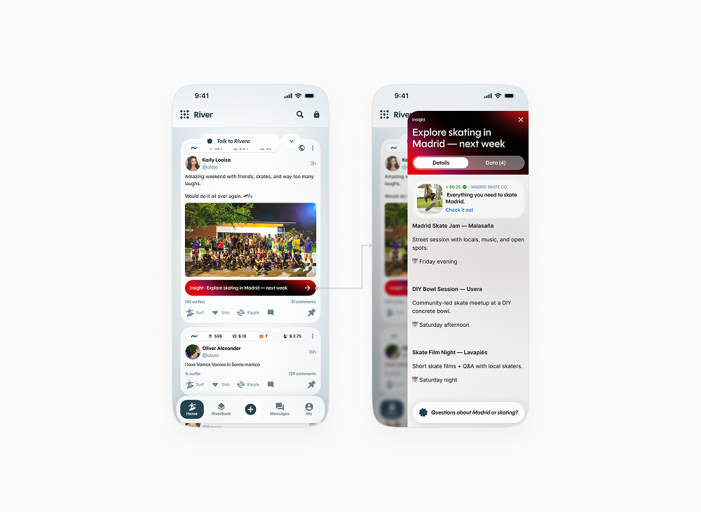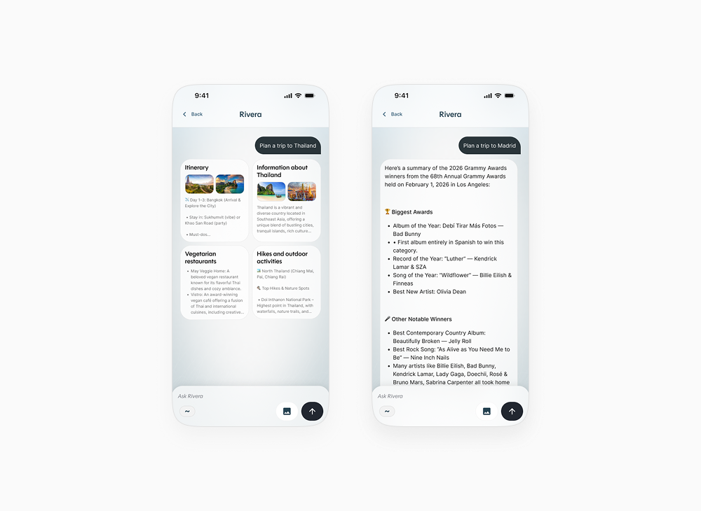 Accessible directly from the top of the feed, Rivera allows users to search or ask anything without interrupting their browsing flow. Responses adapt based on complexity. Simple chat for quick questions. BentoBox structure for multi step needs like planning.